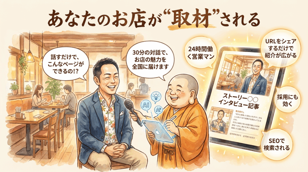 30分の取材で、AIインタビューライターがあなたのお店の想い・こだわり・物語を引き出し、